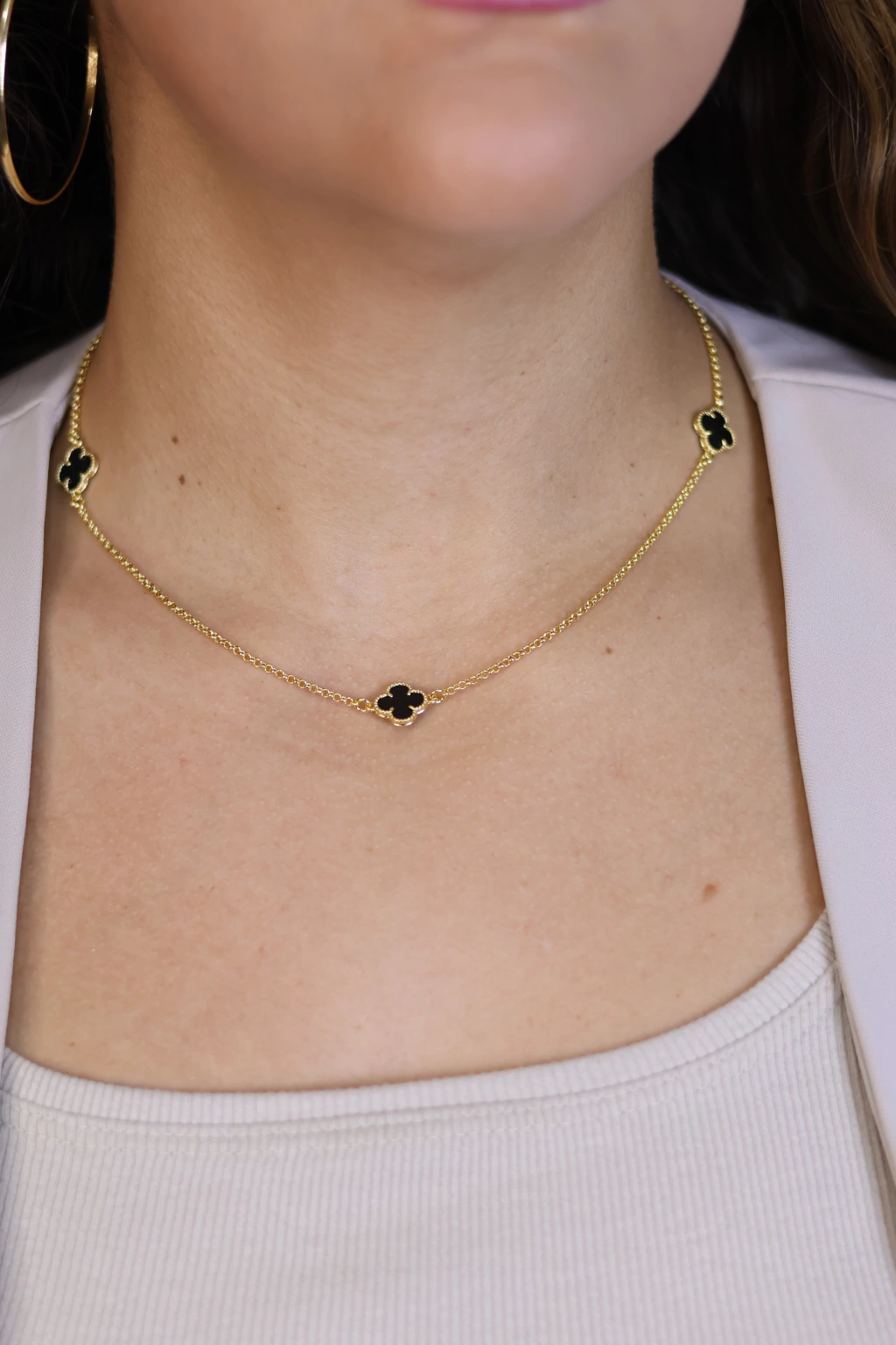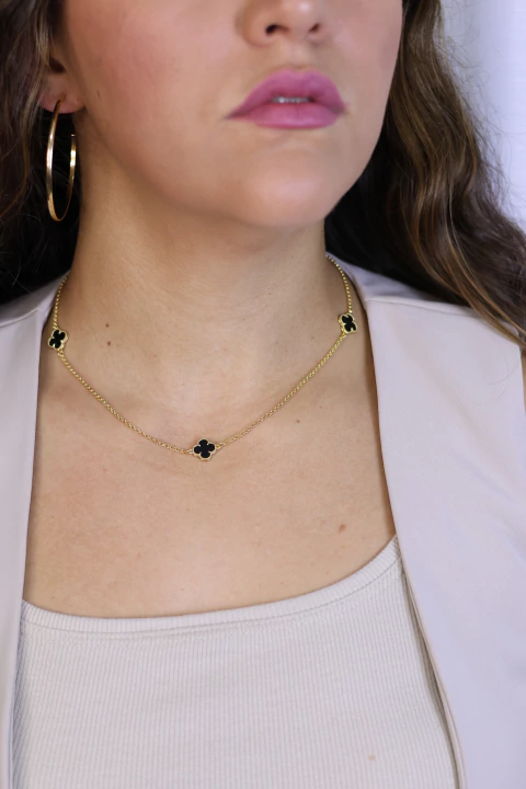 Colar 3 Trevos Preto 40cm + 5cm de Extensor – Semijoia Banhada a Ouro 18K